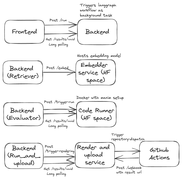 - The render_and_upload is a service (deployed as docker image in Hugging Face spaces) that triggers rendering and uploading part from Github actions and receives the url of rendered video via a callback url from Github actions. In Github actions, manim-ce is installed with necessary dependencies in Ubuntu base image, video is rendered from the generated code, uploaded to Cloudinary and sends the url by HTTP post request to the callback url.